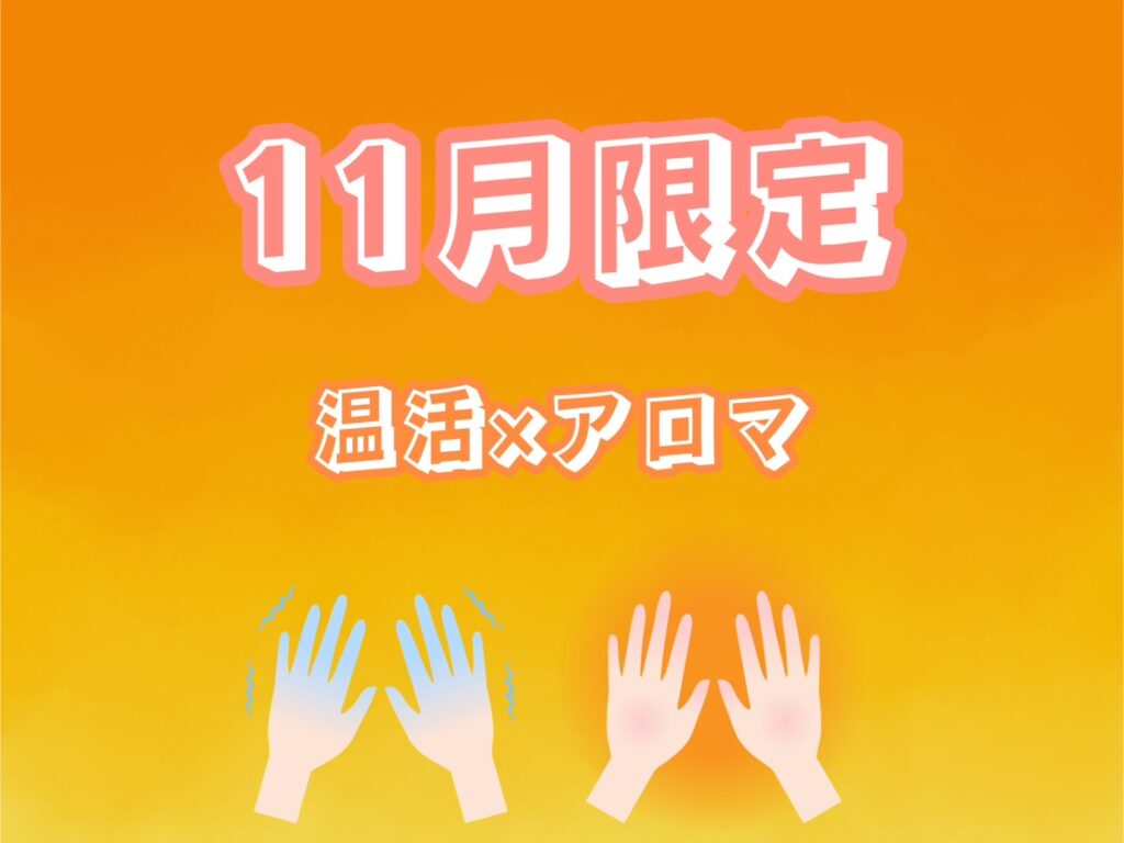 当サロンでは、11月限定で、足湯・温感アロママッサージ・ホットパックを組み合わせた短時間集中ケアをご用意しています。